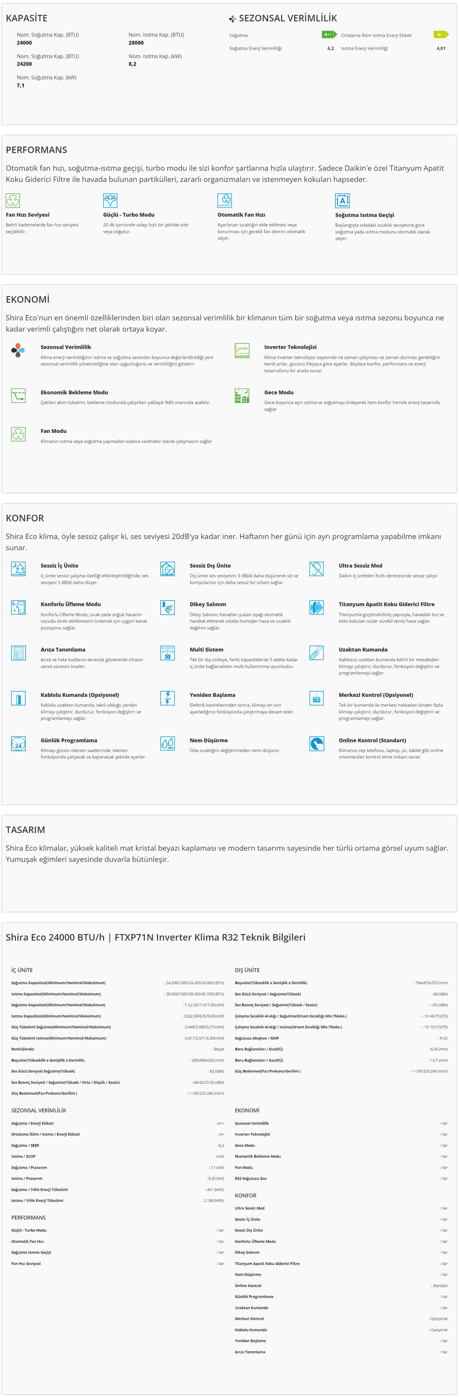 Daikin Shira Eco FTXP71N A++ 24000 BTU Inverter Duvar Tipi Klima
